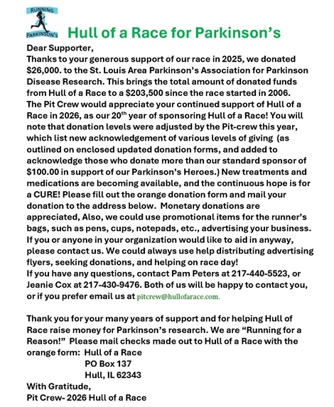Click "Donate Now" or mail checks to: Hull of a Race PO Box 137 Hull, IL 62343
